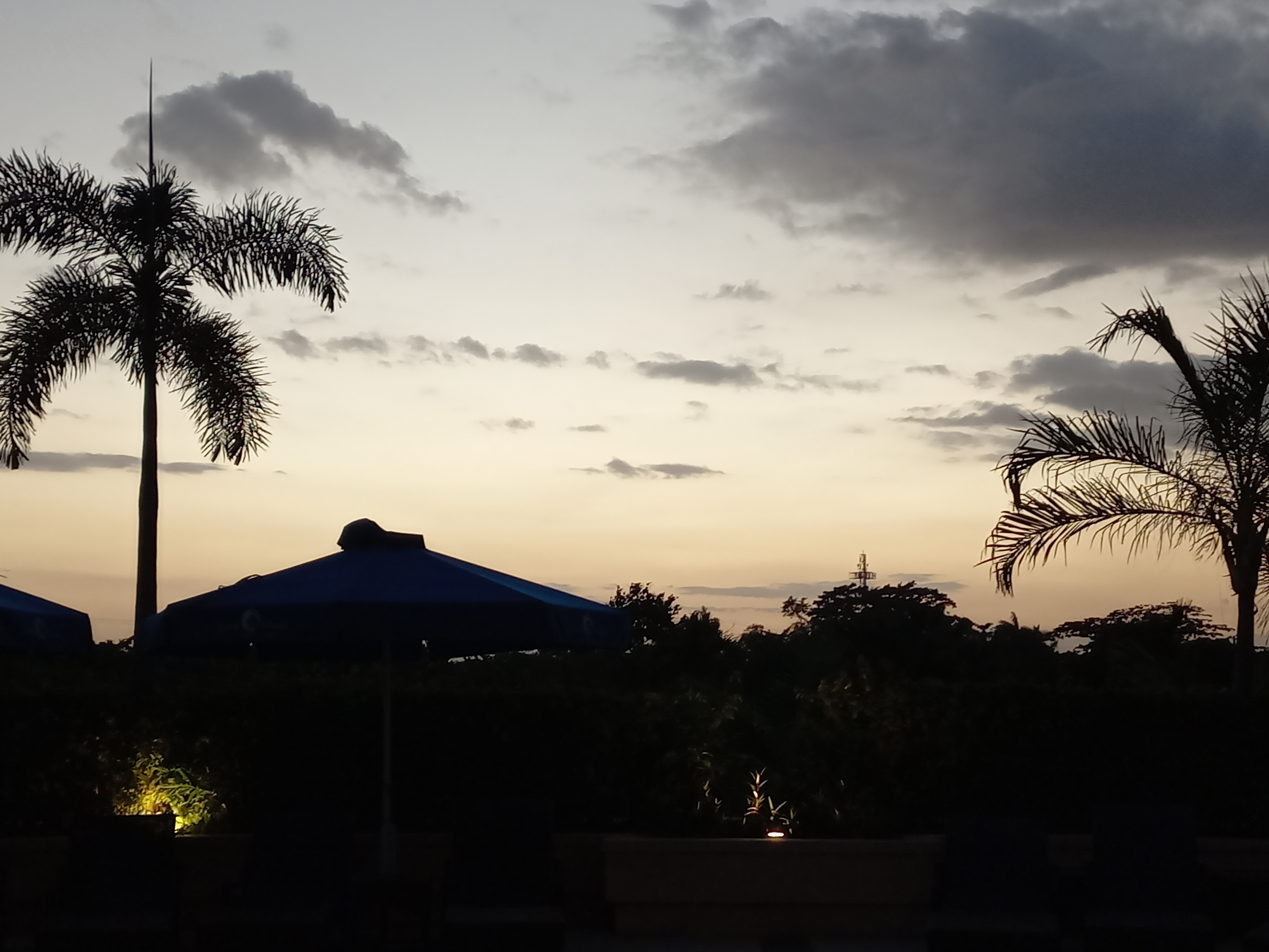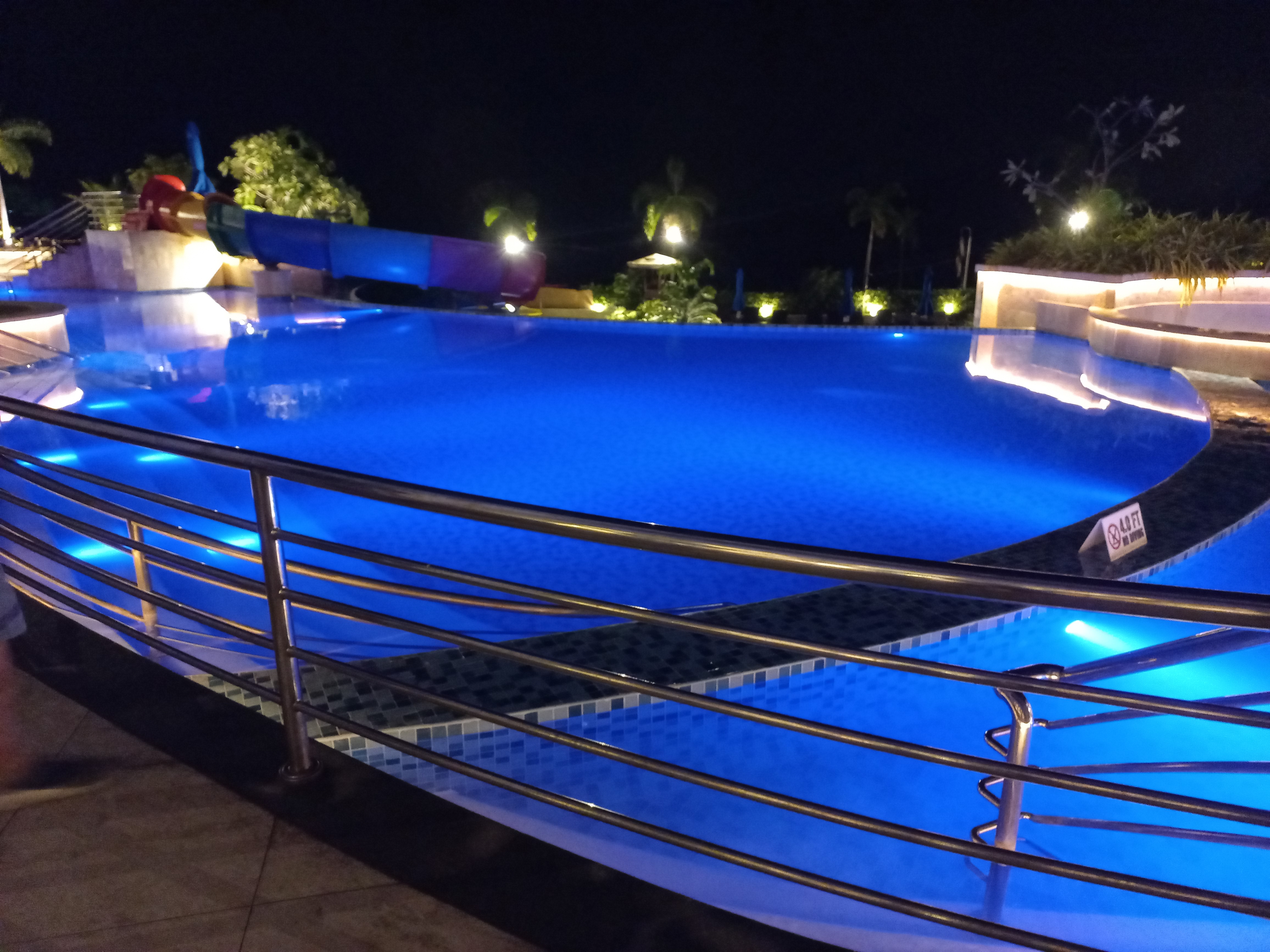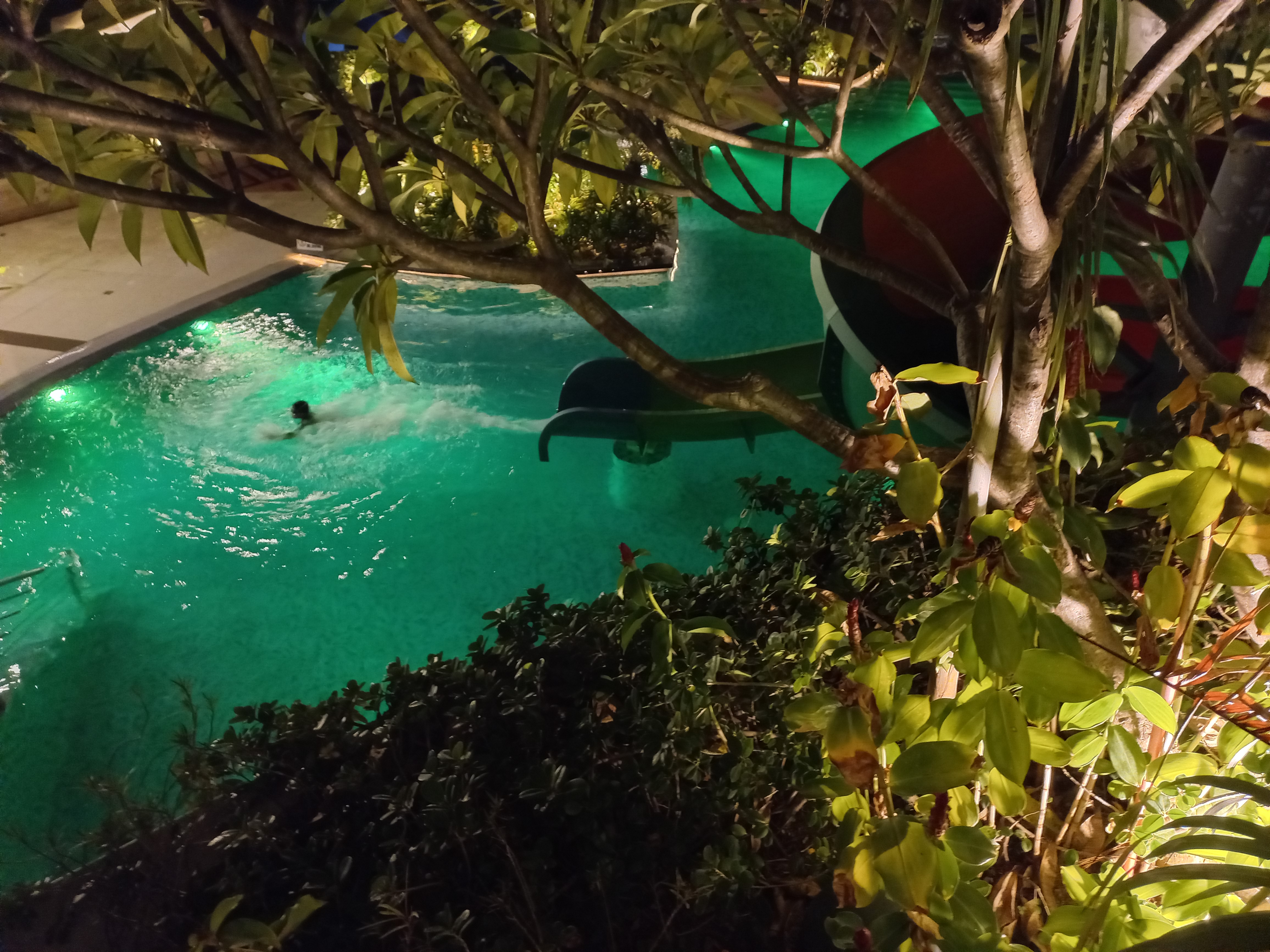저녁즈음 풀장에서 본 노을지는 하늘과 조명 들어온 풀장이에요. 저녁 8시까지 놀 수 있습니다. 따뜻한 온천도 있는데 한번 들어가면 나오기 싫더라구요..^^